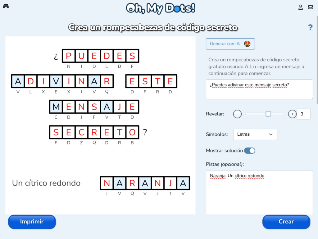 Si prefieres algo más tradicional, Oh My Dots también te permite imprimir tu juego o descargarlo como archivo PDF. Esto significa que puedes distribuir tus acertijos en las aulas, incluirlos en boletines informativos o incorporarlos en materiales didácticos impresos. Ya sea en línea o fuera de línea, tu juego de criptogramas está listo para entretener y educar.